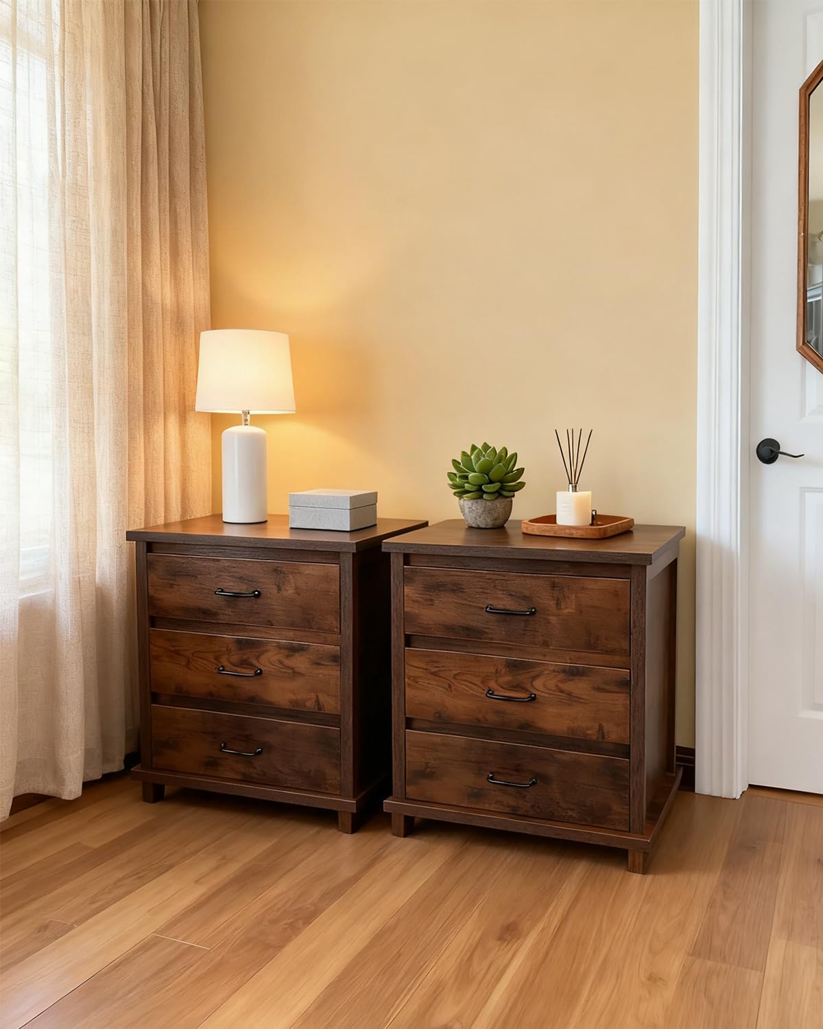 Add timeless charm and functional storage to your space with this Rustic Farmhouse Nightstand. Crafted from reclaimed solid wood, each piece showcases unique natural grain patterns and a weathered finish, celebrating the beauty of imperfections for an authentic vintage farmhouse aesthetic.