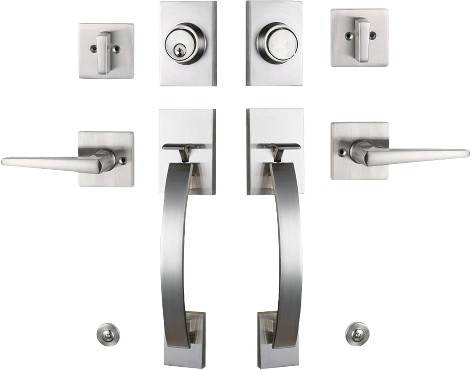 Fits for All of US Standard Size Doors--【Any Hole Distance】This handleset fits for both new door and pre-drilled old ones. Hole distance is adjustable to any size from 210mm (8-1/3 IN) to 250mm (9-5/6 IN). Fit for most of US standard doors. 1.ADJUSTABLE HOLE DISTANCE-Does it fit for my hole? YES, it is fit for both new door and replacement the old, it comes adjustable hole distance 2.Adjustable backset- This Double door handle set with 2 3/8 inch- 2 3/4 inch adjustable backset latch with square corner striker,and fits 1-3/8-Inch-1-3/4-Inch doors. 3.Double Door Handleset This keyed&dummy set comes 2 handle, one is keyed entry handle(active), the other is dummy handle(inactive).<4. Is it reversible for both right and left handed?--YES 5.. Can it be reset with Kwikset Cylinder? Yes,this handle set keys are Kwikset KEY WAY, it is Kwikset Type, you can reset it to be the same keys as your exist keys, the Cylinder can be detached 6. Can it be used to replace Emtek handleset?--YES 7. Fit for doors thickness of 1-3/8" -1-3/4" (35mm and 45mm),Inaddition,our handleset FIT FOR 2 IN THICKNESS 8.Package Includes ALL HARDWARE and template installation needed